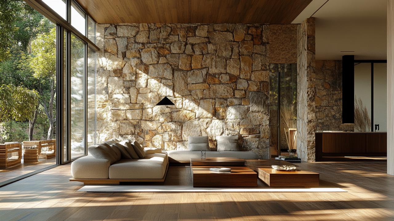 Combinaciones innovadoras de piedra y madera en diferentes ambientes